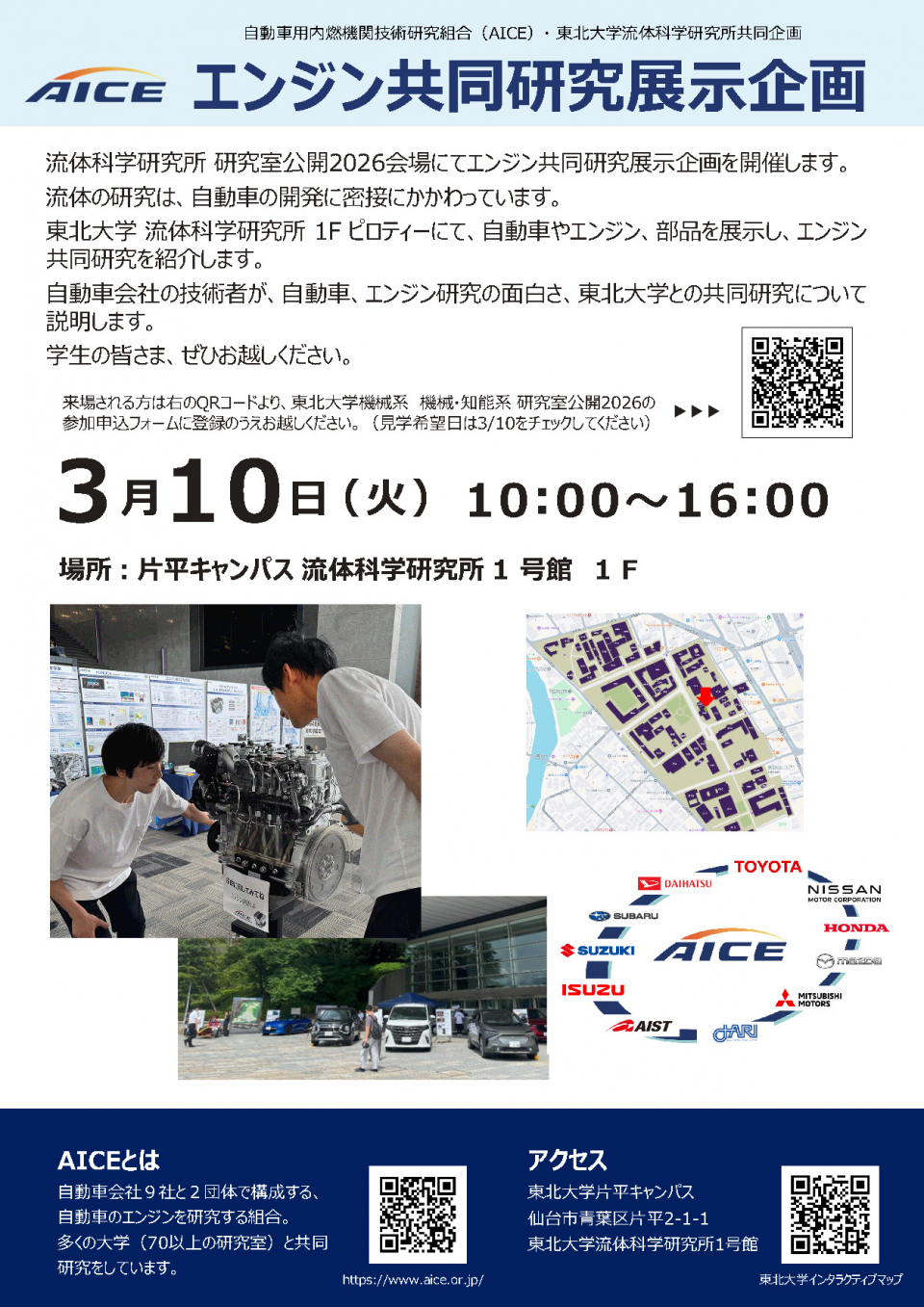 AICE は、東北大学 流体科学研究所 研究室公開2026にて、エンジン共同研究展示企画を開催します。