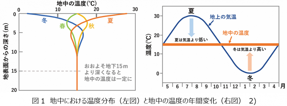 現状では、住宅やオフィスで利用される空調機器の大部分を空気熱源システムが占めています。空気熱源システムは、外気温と室内の空調管理温度との差が大きいほどヒートポンプの運転効率が低下するため、厳暑期・厳寒期は特に電力消費量が増加します。これに対して、地下15mより深い地中が有する温度特性(年間通じて15℃程度でほぼ一定)を活用する地中熱利用システムは、外気温と比較して夏は低く冬は高い温度となる地中熱を熱源利用するため(図1)、ヒートポンプを使用する場合、その運転効率を向上させることができます。結果として大幅な省エネが実現でき、地中熱の利用者に対して脱炭素効果ならびに光熱費(ランニングコスト)削減効果をもたらすこととなります。