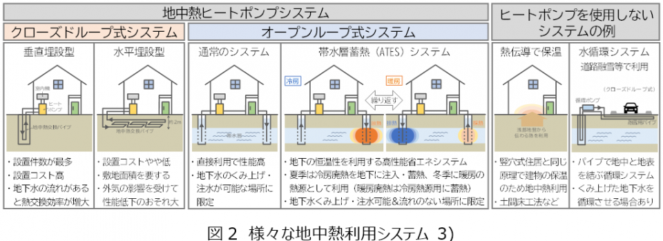 地中熱利用システムでは、高い恒温性を有する地盤や地下水を、熱利用設備の熱源または放熱器として利用します。いずれの利用時においても地中での熱のやりとりが生じますが、その形態は様々です。一般的な地中熱の利用形態を整理したものが図2であり、以下では図2に示す様々な地中熱利用システムについて簡単に解説します。