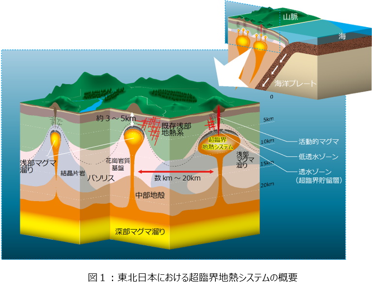 前回のコラムでは、地熱発電は低環境負荷かつ安定した国産の電力を共有可能な発電技術ですが、国内導入量は多くはないのが現状である、とお伝えしました。地熱発電の発電量をさらに増やしていくためには、在来型地熱発電の継続的な導入拡大に加えて、革新的な技術開発によって地熱発電の大量導入が可能となることが望まれます。そこで、これまで検討されている先進的な発電技術のうち、飛躍的に地熱発電の導入量を増加させる可能性がある技術が、超臨界地熱発電です。超臨界地熱発電は、地下3〜5km程度の深さにある400〜500℃の超臨界地熱流体を利用します(図1)。これは、在来型の地熱発電で利用している深さ1.5〜3km、200〜350℃の地熱流体よりもはるかに深部の高圧、高温の環境にある流体で、その開発には高度な技術が必要になります。超臨界地熱発電では1か所で100MWe以上の大きなエネルギーを得ることができると考えられ、発電に適した地域は国内に多く想定されることから、国内の地熱発電量を現在の数倍以上にできる可能性があります。政府が策定した「2050年カーボンニュートラルに伴うグリーン成長戦略1)」や「第6次エネルギー基本計画2)」において、超臨界地熱発電は開発を推進すべき革新的技術に掲げられており、新エネルギー・産業技術総合開発機構(NEDO)の委託研究として産総研、大学、企業等が連携して関連技術の研究開発を進めてきました。