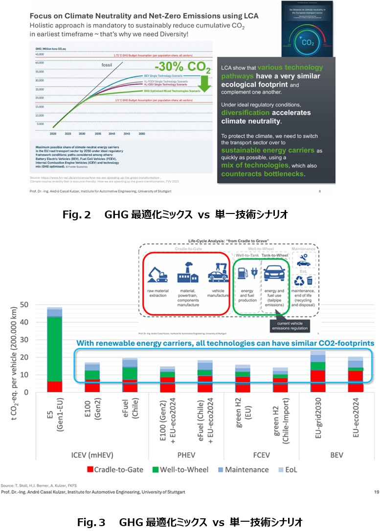 FVV Future Fuel Study IVbの研究成果である、GHG最適化ミックス vs 単一技術シナリオ(Fig.2)では、BEV単独、FCEV単独、H₂-ICEV単独といった「単一技術パス」では、パリ協定のGHGバジェットを満たすことが困難であることを示している。横軸が年度、縦軸が欧州運輸部門のカーボン累積量、赤線が1.5℃シナリオ、1.75℃シナリオ(EU責任分のみ)を示す。複数技術を組み合わせた「GHG最適化ミックスシナリオ」では、より早期に、かつBEV単独シナリオよりも30%排出を削減できる。これは、技術多様性がレジリエンスを高め、脱化石燃料を加速するというFVVのマルチパスアプローチを強く裏付ける。