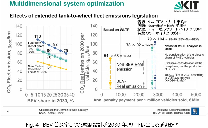 Fig.4は、BEV普及率とCO₂規制設計が2030年のフリート排出に与える影響を示している。左図は、BEV比率の上昇によるフリート平均CO₂排出量の低下と、CCF導入によるLCA評価の公平化を示す。右図は、現行のペナルティ制度が実排出量と乖離し、BEVICEの扱いに不均衡が生じていることを示唆している。