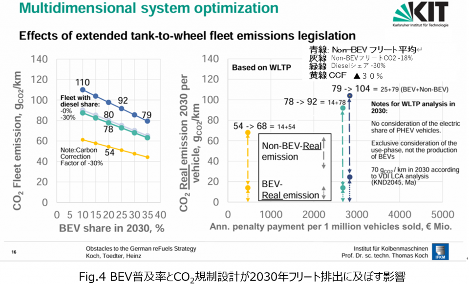 Fig.4は、BEV普及率とCO₂規制設計が2030年のフリート排出に与える影響を示している。左図は、BEV比率の上昇によるフリート平均CO₂排出量の低下と、CCF導入によるLCA評価の公平化を示す。右図は、現行のペナルティ制度が実排出量と乖離し、BEVとICEの扱いに不均衡が生じていることを示唆している。