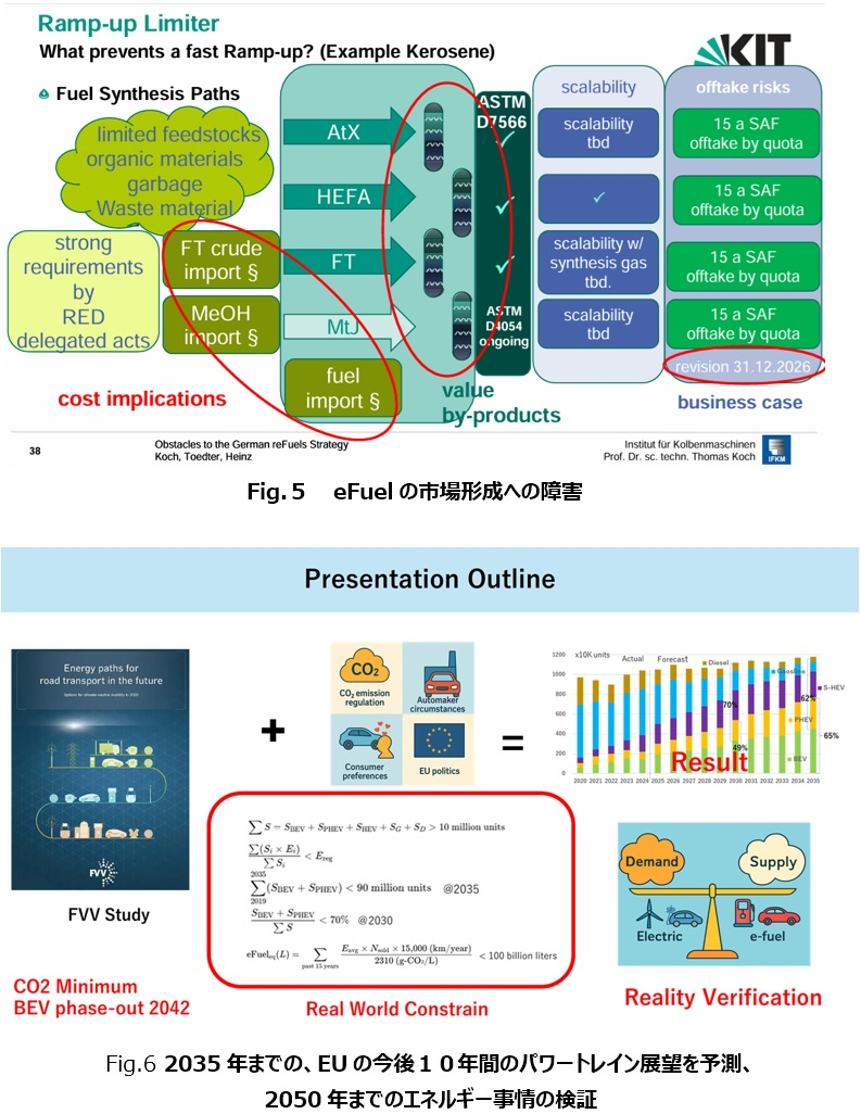 2024年にEU与党・欧州人民党(EPP)が提示したCO₂規制緩和見直し案を起点に、FVV Future Fuel Study IVbのシミュレーションモデル計算結果による単一技術ボトルネックに着目した分析をAICEに寄稿した。本稿はFVVとしての組織的な公式発表ではなく、竹内個人のEPPの見直し案を前提に、20252035年のEUにおける今後10年間のパワートレイン展望を予測し、2050年までのエネルギー需給が成立し得るかを検証したものである(Fig.6